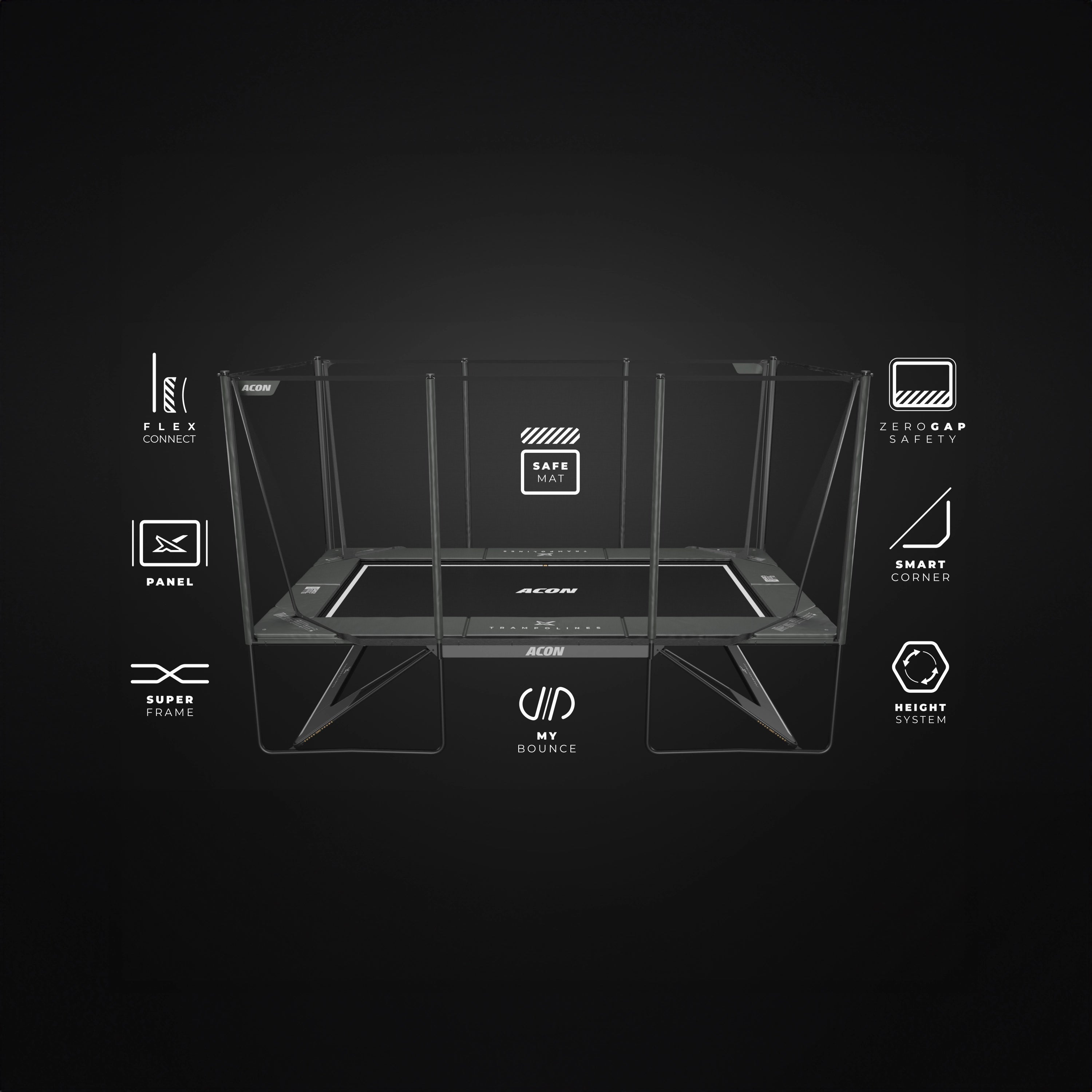 Tutustu yhdeksään patenttia odottavaan ominaisuuteen, jotka erottavat Acon X:n muista trampoliineista ja takaavat entistäkin paremman turvallisuuden, suorituskyvyn sekä helppokäyttöisyyden.